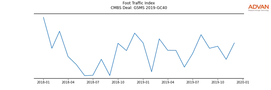 Advan Research computes accurate daily foot-traffic for all the properties and loans of the GSMS 2019-GC40 deal. Here is the foot-traffic aggregated across all the properties of the deal: