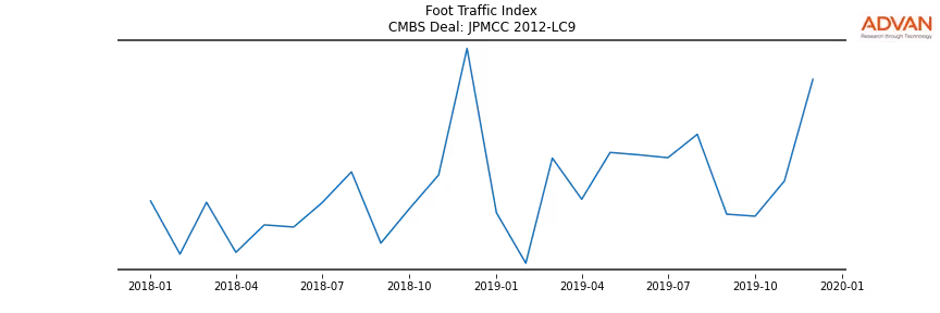 Advan Research computes accurate daily foot-traffic for all the properties and loans of the JPMCC 2012-LC9 deal. Here is the foot-traffic aggregated across all the properties of the deal: