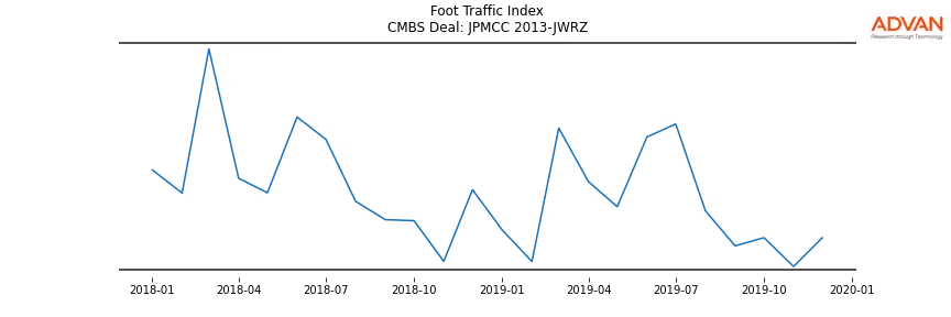 Advan Research computes accurate daily foot-traffic for all the properties and loans of the JPMCC 2013-JWRZ deal. Here is the foot-traffic aggregated across all the properties of the deal: