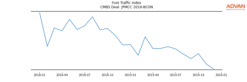 Advan Research computes accurate daily foot-traffic for all the properties and loans of the JPMCC 2018-BCON deal. Here is the foot-traffic aggregated across all the properties of the deal: