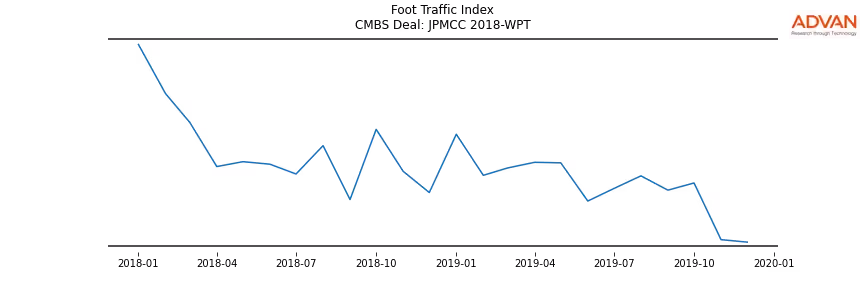 Advan Research computes accurate daily foot-traffic for all the properties and loans of the JPMCC 2018-WPT deal. Here is the foot-traffic aggregated across all the properties of the deal: