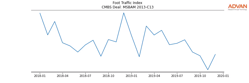 Advan Research computes accurate daily foot-traffic for all the properties and loans of the MSBAM 2013-C13 deal. Here is the foot-traffic aggregated across all the properties of the deal: