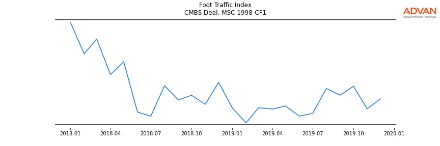 Advan Research computes accurate daily foot-traffic for all the properties and loans of the MSC 1998-CF1 deal. Here is the foot-traffic aggregated across all the properties of the deal: