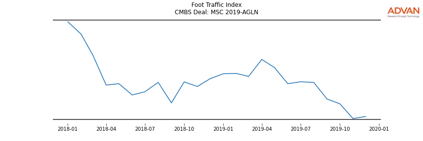 Advan Research computes accurate daily foot-traffic for all the properties and loans of the MSC 2019-AGLN deal. Here is the foot-traffic aggregated across all the properties of the deal: