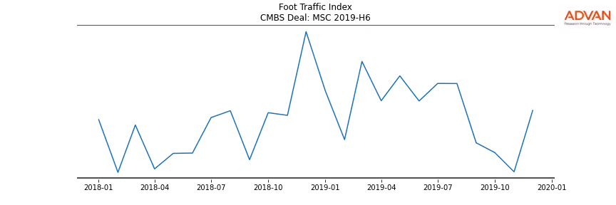 Advan Research computes accurate daily foot-traffic for all the properties and loans of the MSC 2019-H6 deal. Here is the foot-traffic aggregated across all the properties of the deal: