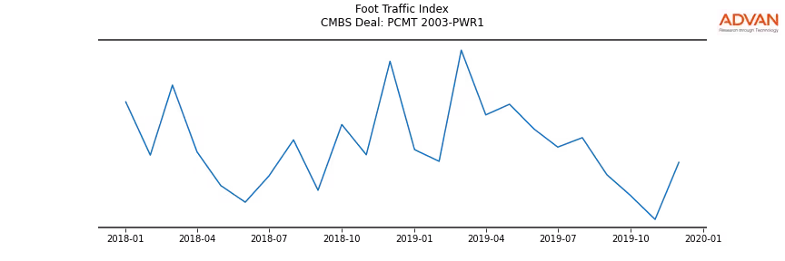 Advan Research computes accurate daily foot-traffic for all the properties and loans of the PCMT 2003-PWR1 deal. Here is the foot-traffic aggregated across all the properties of the deal: