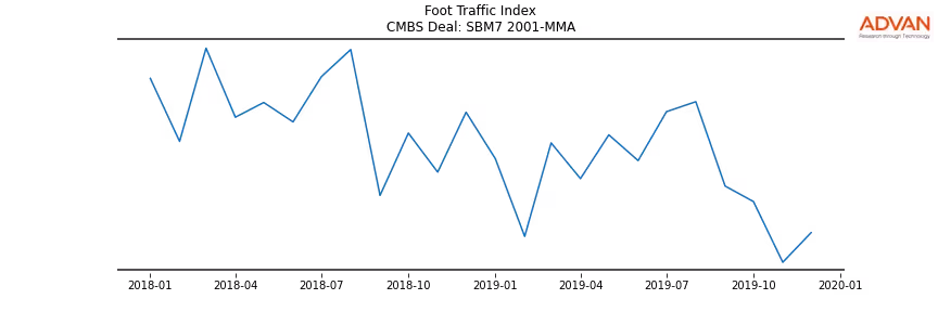 Advan Research computes accurate daily foot-traffic for all the properties and loans of the SBM7 2001-MMA deal. Here is the foot-traffic aggregated across all the properties of the deal: