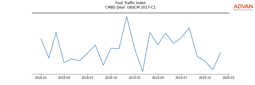 Advan Research computes accurate daily foot-traffic for all the properties and loans of the UBSCM 2017-C1 deal. Here is the foot-traffic aggregated across all the properties of the deal: