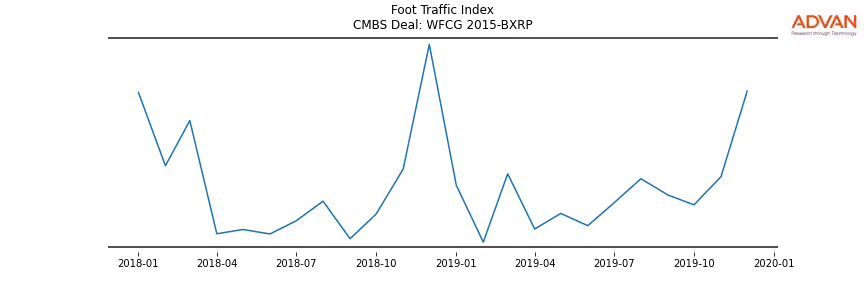 Advan Research computes accurate daily foot-traffic for all the properties and loans of the WFCG 2015-BXRP deal. Here is the foot-traffic aggregated across all the properties of the deal: