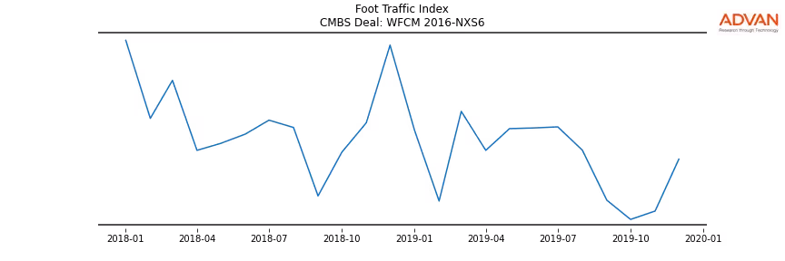 Advan Research computes accurate daily foot-traffic for all the properties and loans of the WFCM 2016-NXS6 deal. Here is the foot-traffic aggregated across all the properties of the deal: