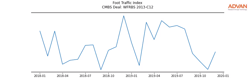 Advan Research computes accurate daily foot-traffic for all the properties and loans of the WFRBS 2013-C12 deal. Here is the foot-traffic aggregated across all the properties of the deal: