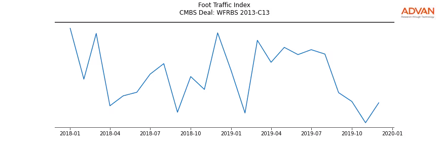 Advan Research computes accurate daily foot-traffic for all the properties and loans of the WFRBS 2013-C13 deal. Here is the foot-traffic aggregated across all the properties of the deal: