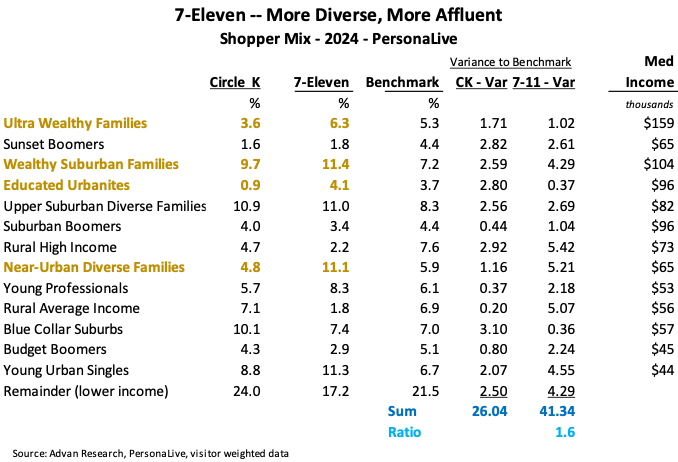 Speaking of opportunity, when looking at the shopper mix between the two operators, one would expect Circle K’s greater sales productivity to stem from a more affluent customer, however, as shown in the table below, 7-Eleven has vastly higher level of affluence (10%) in its customer mix, as well as a vastly more diverse mix than the national benchmark (1.6X that of Circle K). This suggests that it has ample opportunity to micro-merchandise its stores to tailor mix to the trade area profile to vastly improve the relevance and profit-mix-enhancement.
