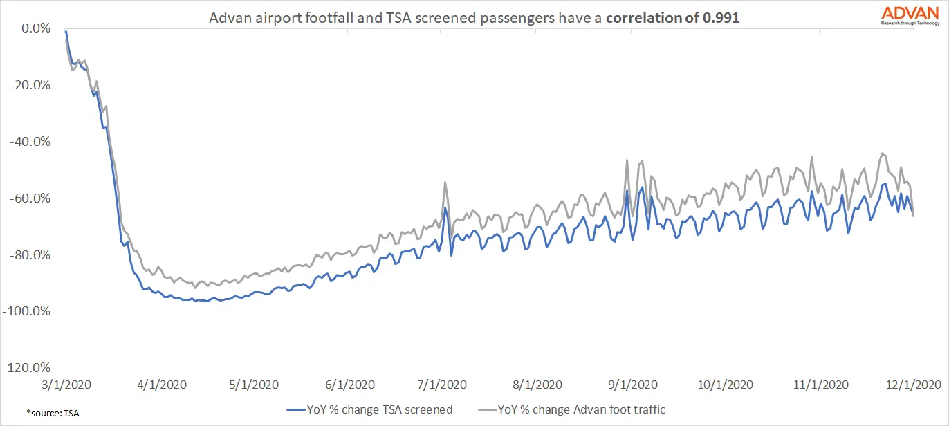 Comparison with TSA screened passengers shows a very high correlation over time, of over 99%. This means that foot traffic data provides almost 100% confidence in showing the number of travelers passing through airports in the US.