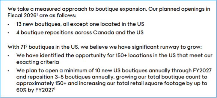 The graphic above shows that Aritzia is finding the highest $-volume growth (+42%) in Chicago and New York, followed by Los Angeles, Boston, and New Jersey. Additionally, the 42% growth’s composition is +31% growth in customers and +10% growth in per-customer spend. For New York City, the region’s +21% growth can be broken down between +12% in customers and +9% on a per-customer basis. The company had 5 locations in NYC at the start of the period and ended with 6. The graphic also shows strong growth (green shade) where Aritzia doesn’t have store locations (they call them boutiques), with that growth driven by strong e-commerce growth, which grew by +54% overall in the US for the fiscal period. Aritzia’s revenue mix is (65 / 35 stores / online). Separately, the boutiques delivered “outstanding comparable sales growth,” per management, with that growth being traffic / transaction driven. Company-wide, comp-sales increased by +34%, with the US above that rate.