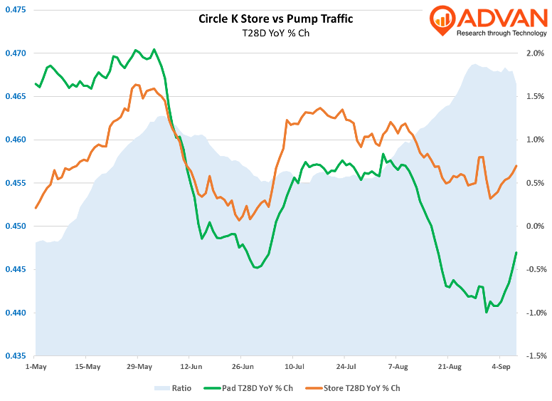 Circle K’s quarterly results were less punchy, but improving. The US region made $0.48 per gallon on inside-the-store sales and a $0.45 per gallon fuel margin. Inside comp-sales increased only +0.4%, which still left the 2-year stack down, at -0.7%. Operating profit growth was flat YoY. CFO Alex Miller said, “This positive performance of same-store sales in our U.S. market was a first in many quarters, and we continue to see positive momentum building up… The Roller Grill offer was our top performer alongside bakery and breakfast sandwiches.” The trends shown below support Miller’s view; inside-the-store traffic is outpacing pad traffic and its ratio to pad traffic is steadily improving. (The slump in June likely reflects the month’s adverse weather.)