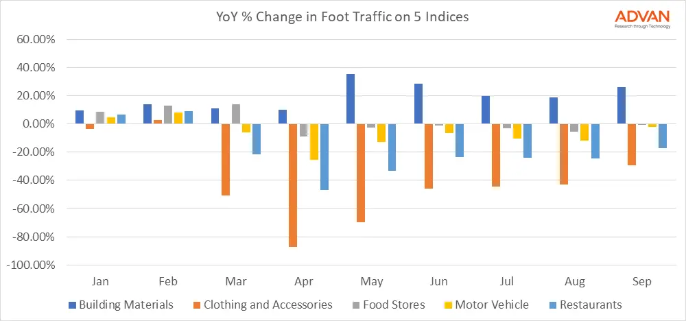 Our foot traffic indices capture trends that show just how varied the path has been. We looked at the percentage change in foot traffic for 5 different sectors during each month of this year.