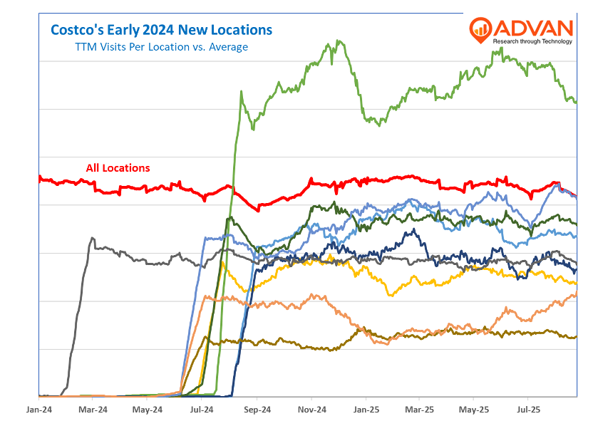Given the favourable membership and macro trends, management indicated that they will continue to open a consistent number of new clubs, remember that Sam’s is newly expanding in the US. As shown below, new locations open explosively, but they take a number of years to mature. Sometimes, there are very strong new locations like the one at Tomball, TX that opened in July ’24, and Riverbank, CA -- June ’24. As the second panel shows, the new Tomball location has put the hurt on the neighbouring Walmart. By contrast, the Target in Riverbank has seen its traffic undiminished.