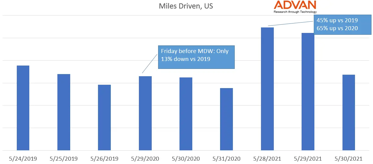 We examined how many miles Americans drove on the Fridays leading into the MDW - this past Friday, May 28, compared to Friday, May 24, 2019, and Friday, May 29, 2020. Since the onset of COVID-19, one of the most identifiable trends in travel has been the increase in driving as people avoided public transportation. Our data, illustrated in the below graph, shows only a 13% decrease in automobile traffic for MDW in 2020 vs. 2019 - a surprising statistic given that many Americans were still under lockdown at that time. This year, it was clear that Americans were eager to return to the beach during the holiday weekend – traffic was up a staggering 65% from 2020 and up 45% from 2019.