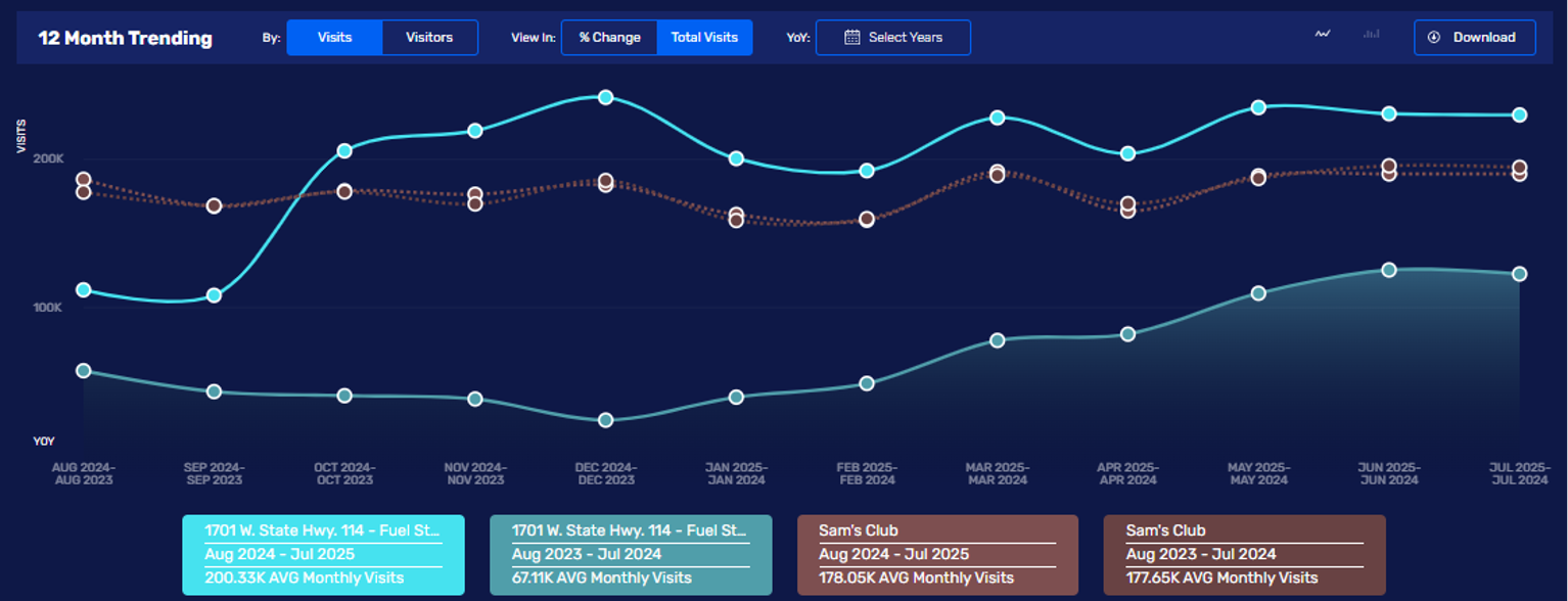 Last fall, Sam’s opened its new club format in Grapevine (1701 W State Hwy 114), which doesn’t have traditional checkout POS; it’s solely Scan-&-Go (vs. approx. 40% of transactions chainwide). The location also has twice the number of curbside spots (32) of a typical club location. As shown in the chart below, Grapevine does 12% more traffic than the average of the 23 Sam’s in the region (100 mile radius). Due to the Scan-&-Go, its dwell time is 4% less than the region’s average. The Grapevine location has a more-affluent customer than the average; it's median HHI / percent-of-households with >$125K in HHI is $142K / 46% vs. $102K / 28% regional average. (Remember that as the affluent out-spend the average, their contribution to the location’s sales will be far larger than these %-figures.) Looking at the differences one layer deeper is shown in the following table of top-10 clusters out of Spacial.ai’s 80 clusters. This location’s customer mix is very idiosyncratic to the other Sam’s in the regions, and its shopper mix is far more similar to the nearby Costco (2601 W State Hwy 114). The third figure below shows this Costco’s monthly visits over the past year (light purple), to the base period (dark purple), and since the Sam’s opening, it’s been down each month with the gap widening. Prior to the opening, the Costco was consistently up YoY. In Q3’24, 32% of this Costco’s visitors also visited the Sam’s; by Q2’25, this had increased to 50%. That’s a lot of competitive encroachment and it implies a lot of wallet share capture by Sam’s. Sam’s just opened another one of these clubs in Tempe, AZ, with more to follow. There isn’t a nearby Costco to the opening, but Target is nearby.