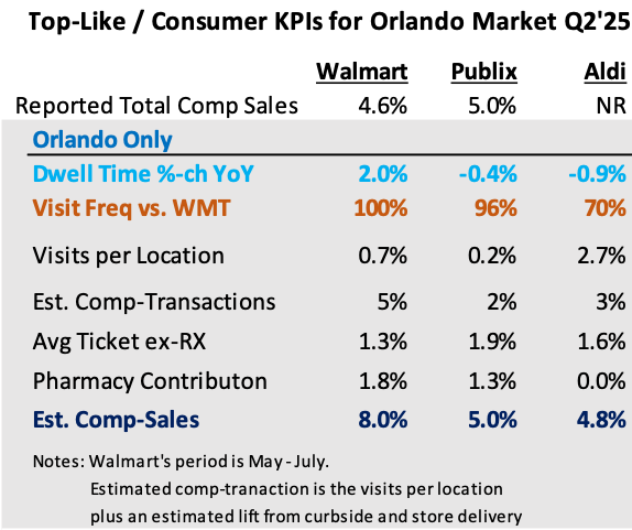 Readers will remember that we’ve been highlighting units per transaction (UPT) as a critical metric to monitor as it typically precedes directional changes in comp-traffic, Sprouts / Grocery Outlet were ’23 / ‘24 examples of this to the + / -. The table’s across the board increase in dwell time implies higher units-per-transaction (UPTs) and successful merchant execution for all four brands. For Sam’s, Scan-&-Go penetration increased 600bps YoY, which ceteris paribus, is a dwell time moderator. Thus, Sam’s +200bps improvement in UPTs is better than what the increase in dwell time implied. Sam’s CEO Chris Nicholas said, “And that's one of the big reasons we're trending so much younger with our new members that we're acquiring. So I think it's online, and I think it's physical too, and I'm excited about what the future looks like for Sam's Club.” Target’s comp underperformance stemmed from weak traffic and increased markdowns, not UPTs, which improved QoQ.