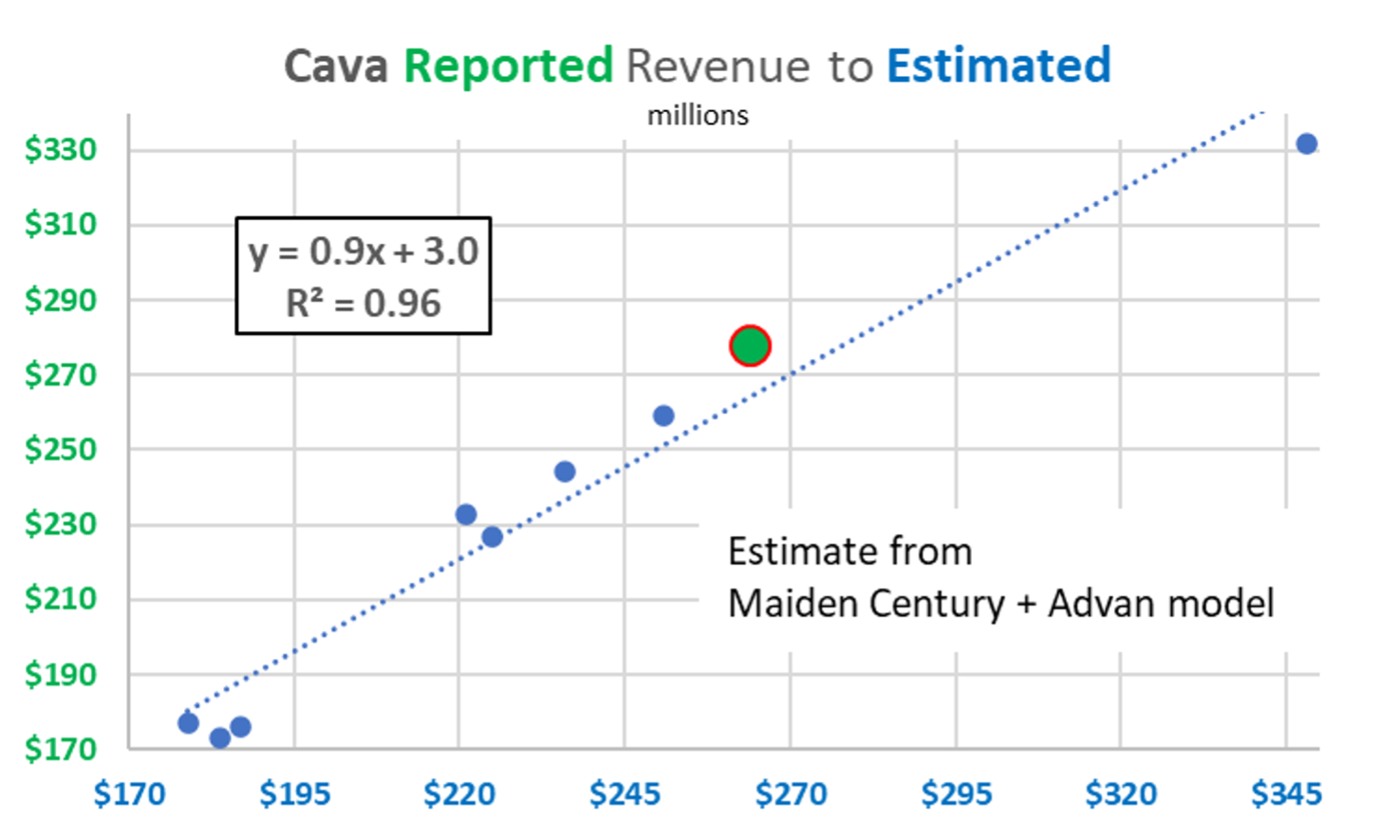 Due to the softness in trend, Cava’s stock lost 20% of its value. The economic pressure looks to be a large factor to Cava’s slower trend. Advan estimates that its average check increased +5% YoY in Q2, implying a 3% decrease in comp-transactions. The scatter plot below is between reported revenue and a fitted model created by Maiden Century using Advan’s observed visitation. The fit at 0.96 is very high; the green dot is Q2, and as shown, the reported model was above the model’s estimate by 5% (or $18M), which exceeds the model’s error range of +/-3.3%. That said, the result was still $8M short of Wall Street consensus expectations. And so, while the result was “less bad” than what our model was projecting, it was worse than investor expectations. Why did the model miss? Well, as shown below, the model more frequently underestimates total revenue. Separately, new store productivity was very strong in the quarter, with sales growth less the comp equal to 18.2%, which is 150 bps ahead of the 16.7% increase in units. Last quarter, it lagged by 90bps, giving a large +250bps QoQ swing. Absent that, the model would have been about 2.5% the reported figure, i.e. in-line with the historical trend. As to Cava’s plans, given still improving store-level returns and new store performance, management logically increased their opening plans from 65-66 to 69. However, comps will need to return to a higher level to soothe concerns about its price points.