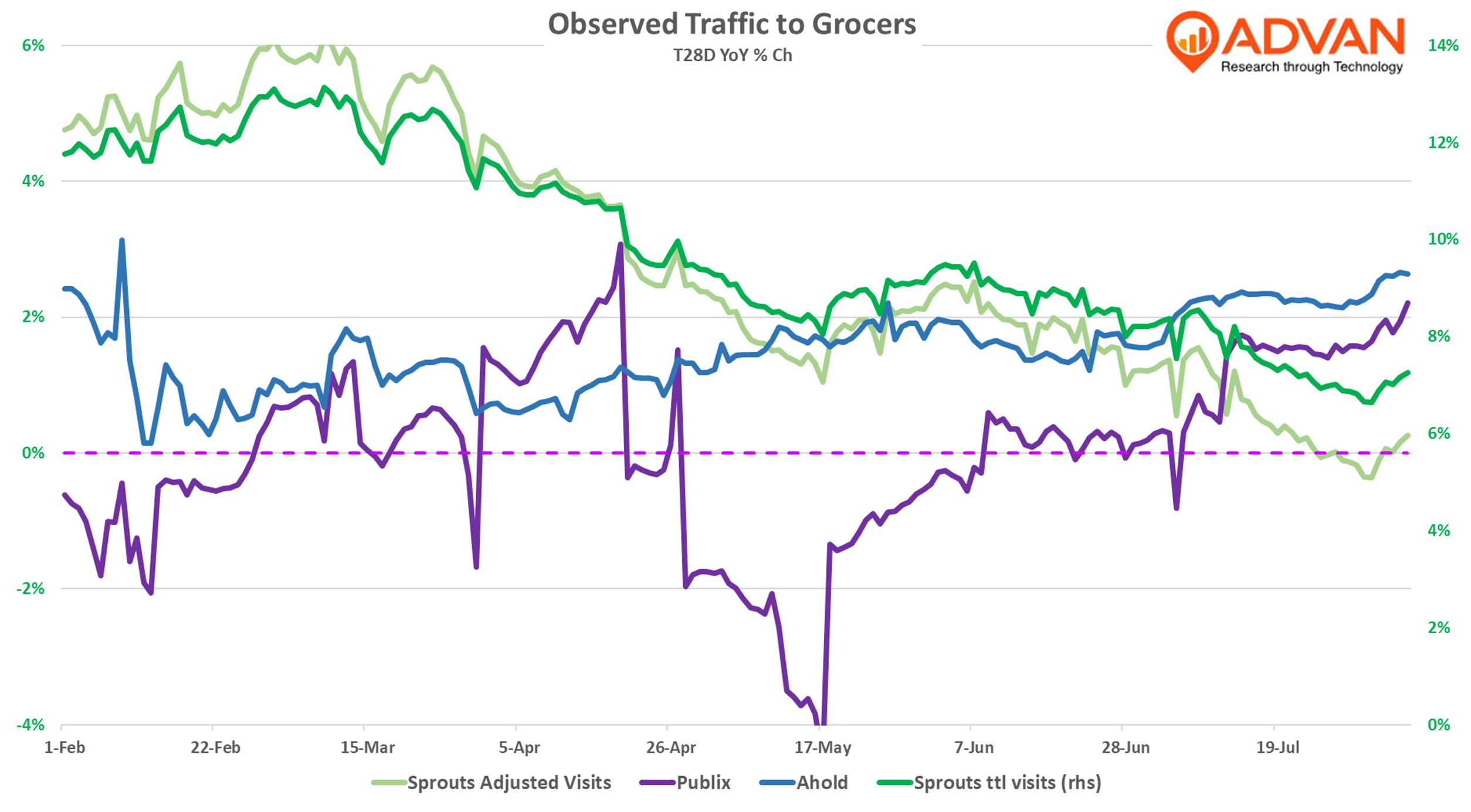 As the chart below demonstrates, Food Lion and Hannaford are driving outperformance in Ahold’s brand portfolio; for Food Lion both frequency of visit and dwell time increased YoY. (The increase in dwell time implies an increase in UPT.) By contrast, Stop & Shop remains volatile and an anchor; its visit decline is the result of fewer visitors, i.e. it is being dropped from consideration and peoples’ routines. Muller, “It has been one year since we announced decisive and deliberate actions to ensure a stable and thriving future for the brand. And since the announcement, we have closed 32 underperforming stores, started price investments with regularly recalibrating based on customer response, continued store models focusing on a more efficient use of capital and a broader store reach, improved store execution and on-shelf availability and deployed communication tactics to maximize customer awareness and emphasize own brands. We are encouraged by customers' response to the initiatives, which we have implemented so far. And where we have made investments, we are attracting new customers, seeing increased volumes and seeing an improved Net Promoter Score. While we are celebrating the wins, we continue to focus on executing the plan, driving sales and finding sustainable and substantial efficiencies. This includes a strong focus on supply chain optimization as well as maximizing promotional effectiveness. In the second half of the year, we will expand our price investments to additional markets, further optimize our assortment and continue our store remodels.”