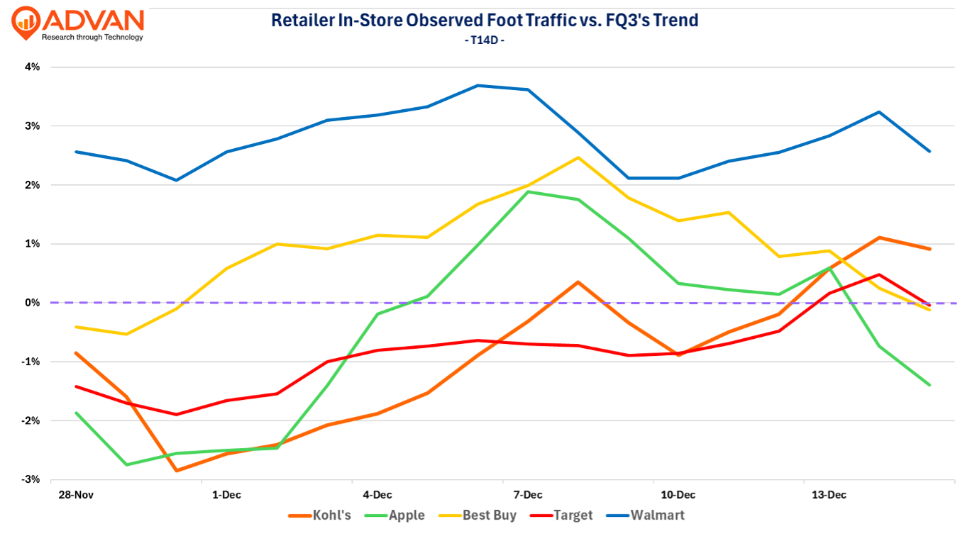 The positive trend in foot traffic has held since Black Friday Weekend. Amazon, Walmart, Five Below, and Ross Stores have continued to outperform in traffic and spend. Best Buy, Target, and traditional department stores are trailing their FQ3 performance.