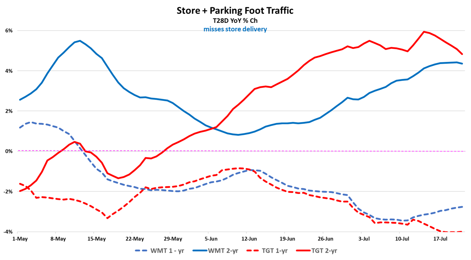 Per June and the retail segments that outperformed, consumer electronics (+0.7%) benefited from the new Nintendo Switch. Building materials & garden supply (+0.2%) was also an improvement; for the segment we show June traffic as only modestly softer, which is what Census’ seasonally adjusted figures also show. The one segment that really stands out in the report is “miscellaneous store retailers” which was up +11.5% and stronger MoM by +230 bps. Driving that segment are two sub-segments, “gift, novelty, & souvenir stores” which increased +23% in May and “used merchandise stores” which increased +7.4% in May. We have to wait to July’s release to get these sub-segment details for June; however, given the +230bps acceleration for the entire segment, we expect the acceleration for these two sub-segments to be far greater. What’s driving that? Less Temu. See our analysis on this dynamic in our note on Five Below.