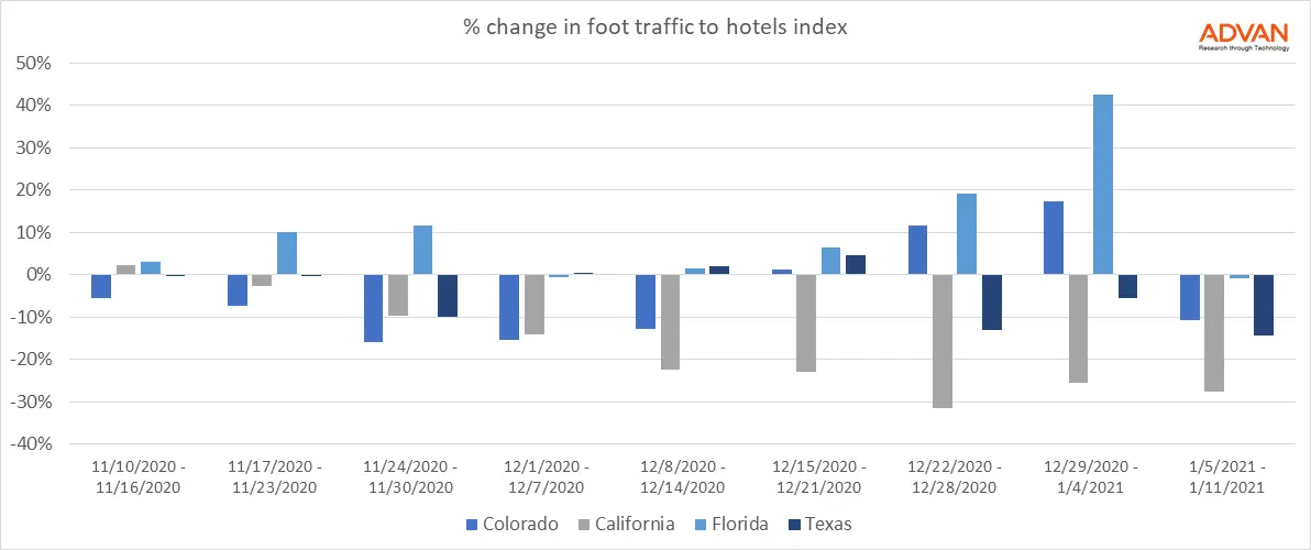 Colorado hotels also saw a healthy increase in traffic of 19% in the final week of the year as skiers took to the slopes over the holidays. California and Texas, however, did not enjoy the same rebound in tourist traffic. In California, hotel visitors were down 31% over the holidays and in Texas it was down over 13% compared to the start of November.