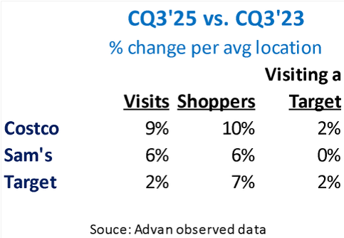 How this channel shifting looks in our data is shown in the table below. Over the past two years, the growth in visits and shoppers has been aligned for Costco and Sam’s; by contrast, Target’s frequency-of-shop has declined. Over the period, while Costco and Sam’s have expanded their shopper base (membership), club members who also visited a Target is little changed, i.e. the incremental households, in aggregate, didn’t give Target consideration.
