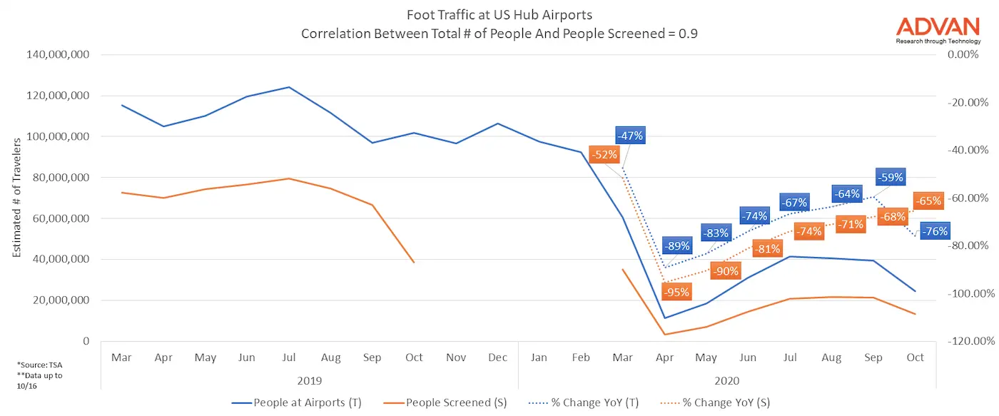 We compared our foot traffic data for the major US hubs with the number of passengers reported as screened by the TSA and found a correlation of 0.9.