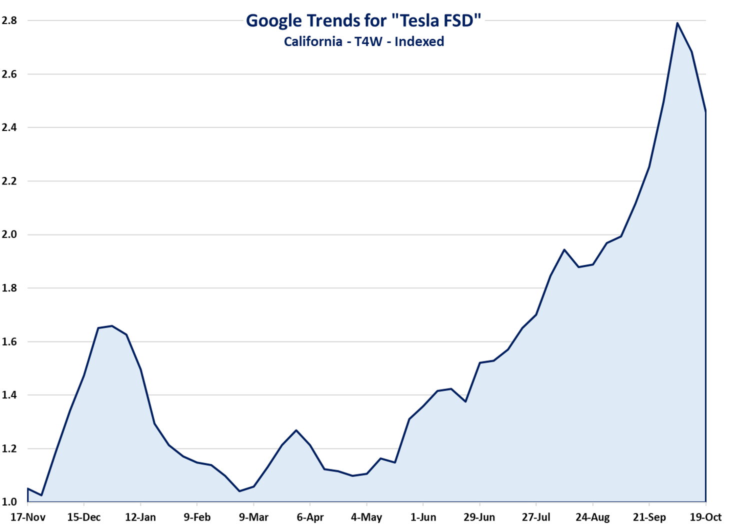 Our read of the above is that demand for Tesla vehicles in the US is stronger than expected and stronger than for non-Tesla EVs, with the “driver” being that Tesla makes highly desirable vehicles (not commenting on the Cyber) and a broadening of interest in FSD and the Tesla ecosystem. As evidence for this viewpoint, interest in Tesla FSD, as measured by Google searches by California residents, is up nearly 3-times from last year’s level. Further evidence is shown in the second chart, with showroom visitation remaining largely stable in late September and October, i.e. no observable air pocket following the expiration of the $7500. Finally, the third figure shows that activity has also largely been stable at the Fremont and Austin plants following the late September surge. Net-net, all signs suggest another good October and Q4 for Tesla vehicle sales in the US.