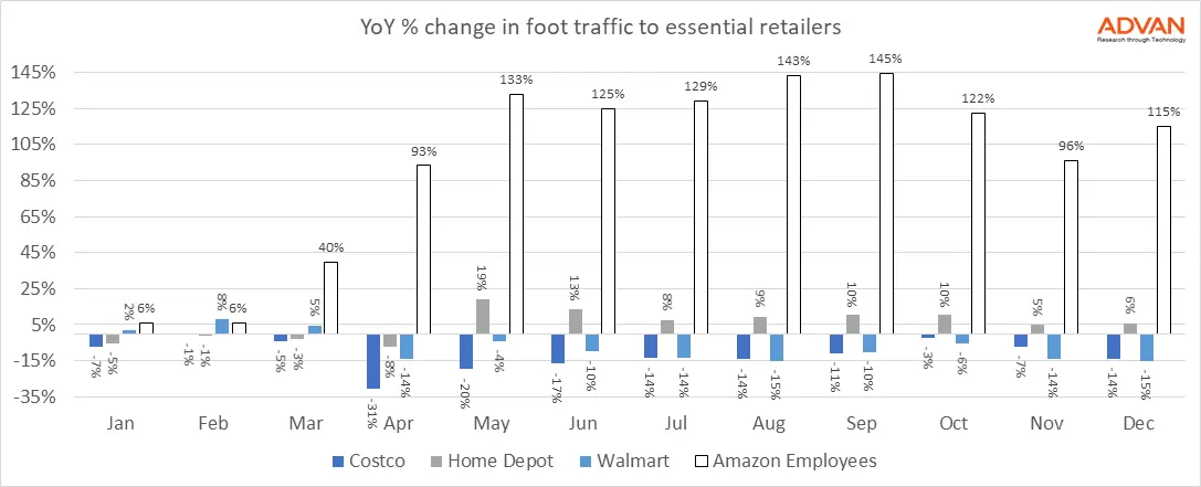 From the very start of the pandemic as we all stocked up on canned goods and toilet paper, and much of the country went into lock-down, foot traffic data clearly showed that big box retailers would be early winners. Despite restricting the number of customers in stores - and the now familiar image of 6ft-spaced line-ups outside - visitor numbers to Walmart and Costco barely fell year-over-year. At its lowest, Costco foot traffic was down 31%. More surprising perhaps was the performance of home improvement retailers like Home Depot which, from May onwards, saw an increase in foot traffic compared to last year. But the clear winner was Amazon. As more shopping moved online, the number of employees at Amazon warehouses went through the roof - as did the company’s revenues, which were up 37% in the third quarter of 2020.