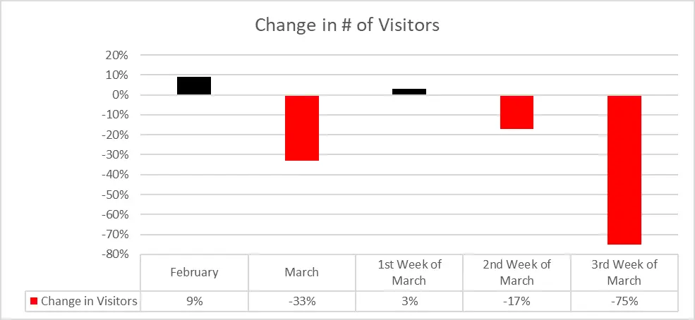 stay home, foot traffic continued to fall. By the third week of March, foot traffic had fallen 75% compared to the same