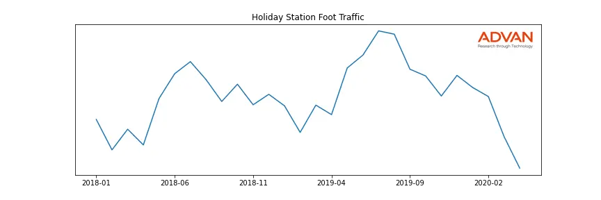Holiday Station along with another 360 companies belongs to the Advan Consumer Staples. The following chart shows the foot traffic index on this sector.