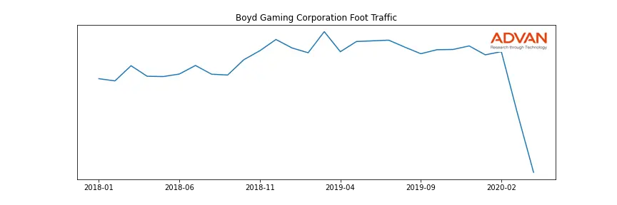 Boyd Gaming Corporation along with another 1766 companies belongs to the Advan Consumer Discretionary. The following chart shows the foot traffic index on this sector.