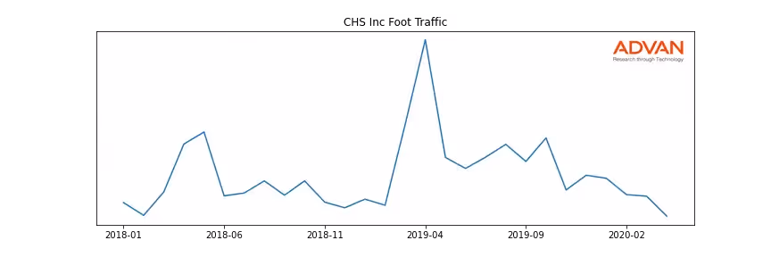 CHS Inc along with another 9 companies belongs to the Advan Consumer Services. The following chart shows the foot traffic index on this sector.