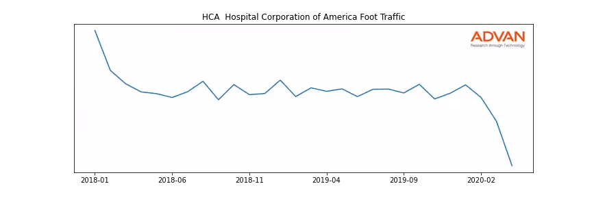 HCA Hospital Corporation of America along with another 144 companies belongs to the Advan Health Care. The following chart shows the foot traffic index on this sector.