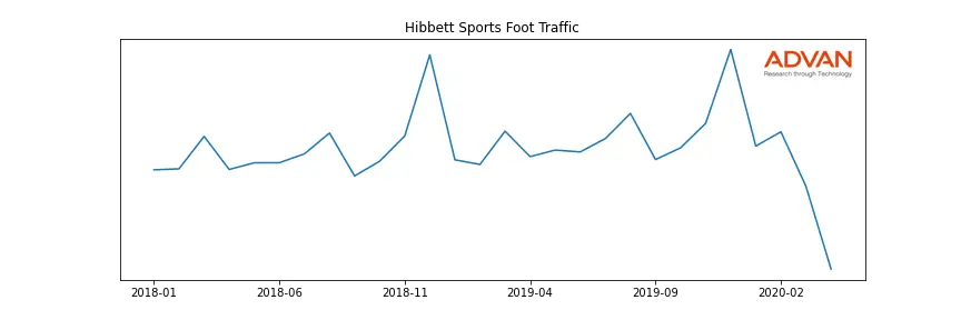 Hibbett Sports along with another 1766 companies belongs to the Advan Consumer Discretionary. The following chart shows the foot traffic index on this sector.