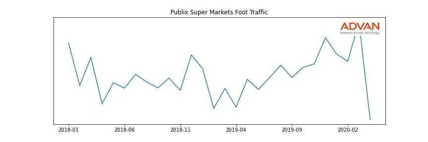 Publix Super Markets along with another 360 companies belongs to the Advan Consumer Staples. The following chart shows the foot traffic index on this sector.