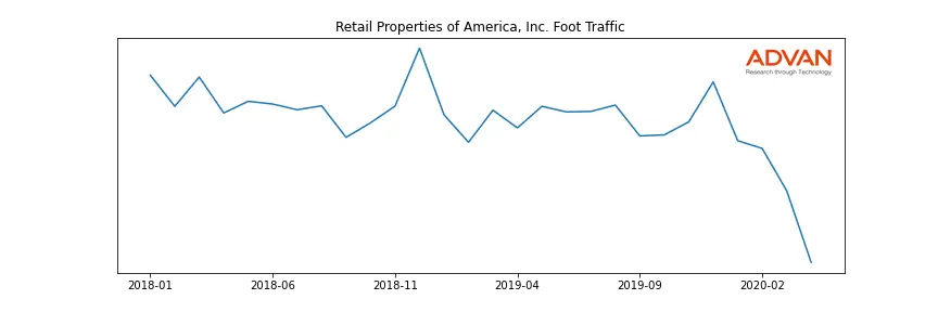 Advan computes cellphone traffic using a dataset of more than 320 million cellphones observed with a second-level time accuracy and 10 meter location accuracy, since 2015. The graph below shows the visits aggregated across all 108 of the locations of Retail Properties of America, Inc.: