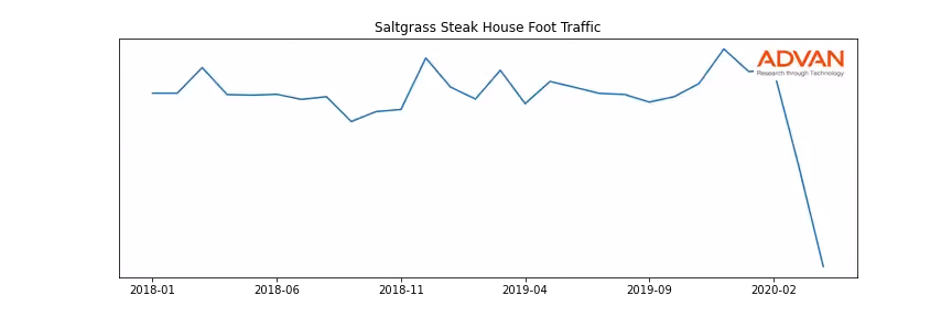Saltgrass Steak House along with another 1766 companies belongs to the Advan Consumer Discretionary. The following chart shows the foot traffic index on this sector.